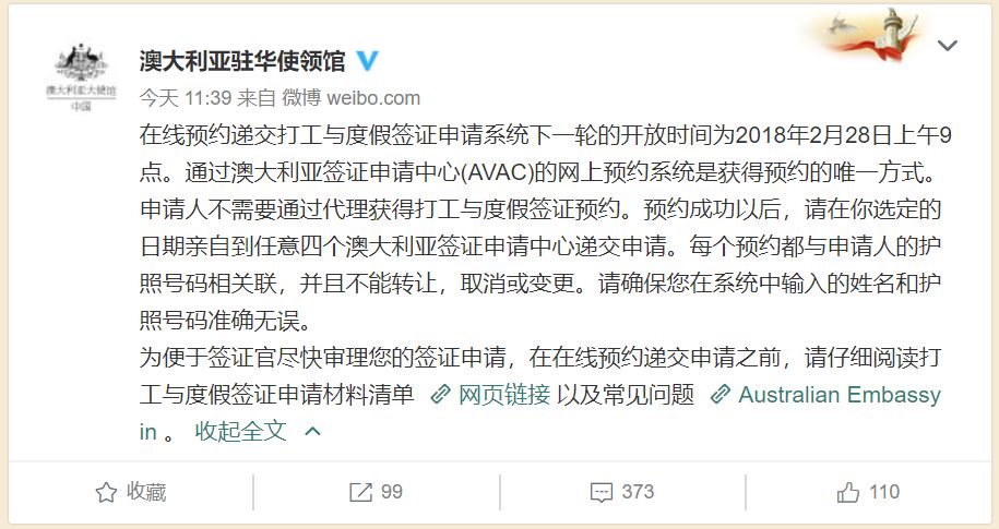 澳洲使领馆官方微博,总是突然通知开放名额的时间。