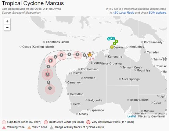 澳大利亚附近热带气旋“马库斯”(Marcus)于17日上午早晨登陆澳大利亚达尔文港(Darwin),中心附近最大风力有10级(26米/秒,相当于我国的强热带风暴级),中心最低气压为982百帕,最高风速高达130公里。其中有6小时的风速超过每小时62公里。