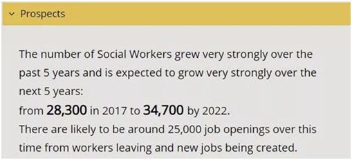 除此之外,澳大利亚作为福利国家,还有海量慈善机构,非营利机构及社会企业,每年都在大力吸收社工人才,如果你有志向在政府部门工作,社工学历也是一块有力的敲门砖。