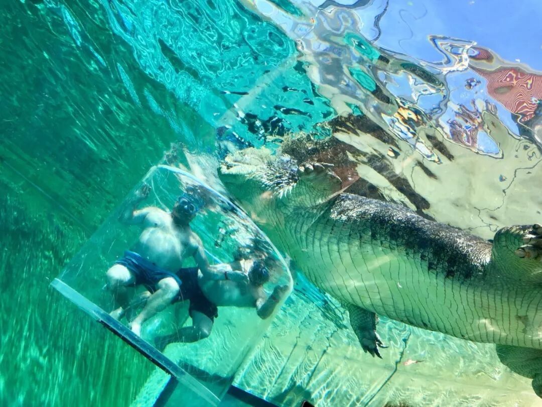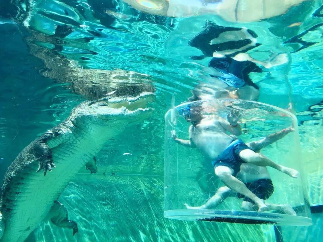 所谓的死亡之笼,是指将1-2名的游客装入一个全透明的圆形玻璃水桶里面,然后玻璃桶慢慢被放入住着大鳄鱼的水池中,让游客和鳄鱼互相对视、与鳄共舞。而摄影师,将会从360°给你拍照留恋。