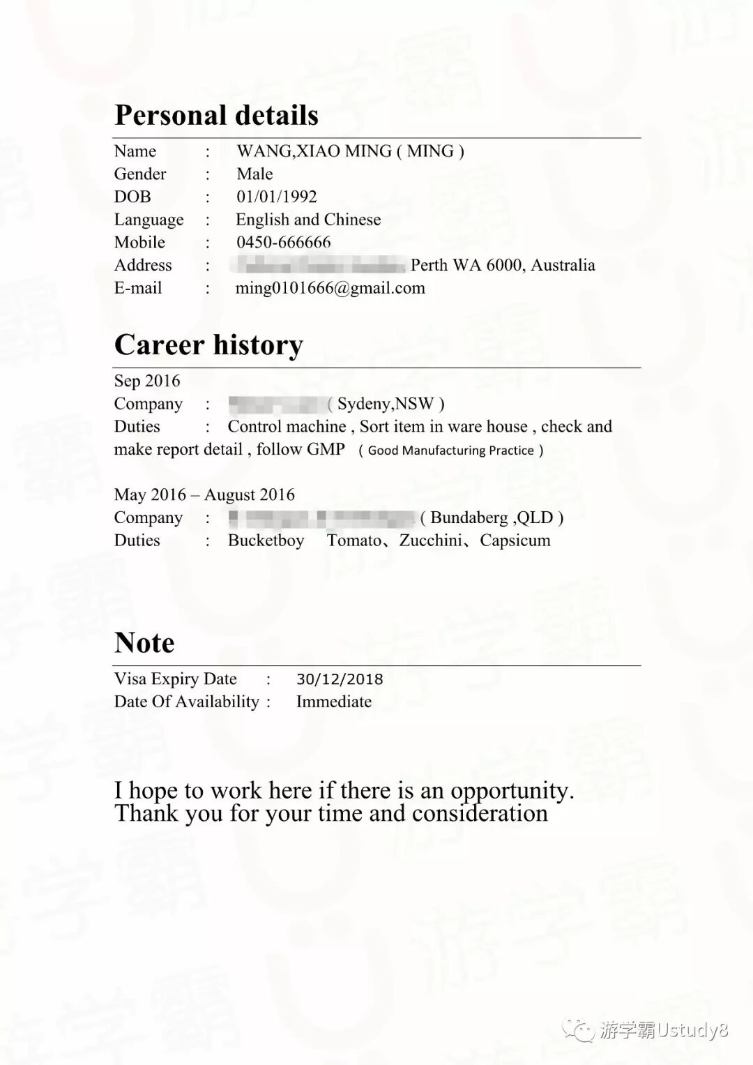 简历大致为个人信息、工作经历、签证到期日这些必要信息!