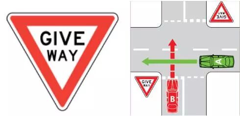 如果路口出现如下图所示的标示牌,则必须给其他进入路口的车辆让行。图示中B车必须减速为A车让行。