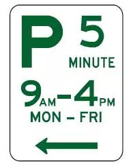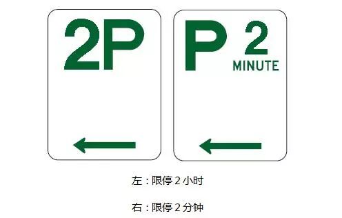 标识牌“P”字样右侧的数字代表停车限时分钟,下方的数字代表限时停车条款的有效期,英文字母是每周的生效日期,