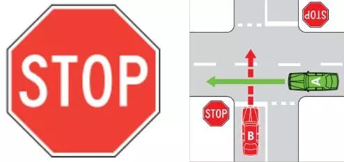 如果路口出现如下图所示的标示牌,则必须停止,并为进入路口的其他车辆让行。图示中的B车必须完全停止为A车让行,即使无车,遇到该标志车辆也必须在停止线前完全停止。