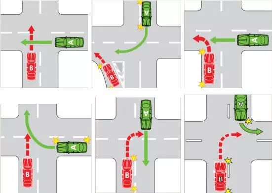 路口让行:如果一个十字路口没有红绿灯,没有任何标识牌,那么直行车辆必须给任何右侧的行驶的车辆让行,如下图中的路口,红色B车必须为绿色A车让行。
