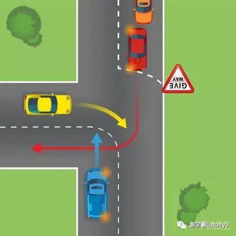 他们解释说:“在这个交叉路口的让路标志使得黄色车辆在连续道路上的路径向右弯曲。”