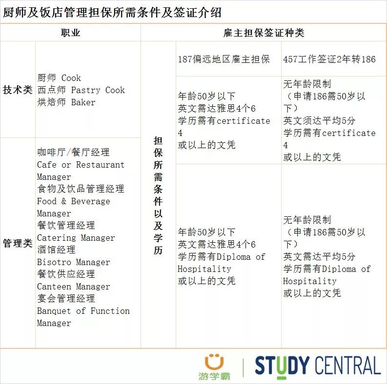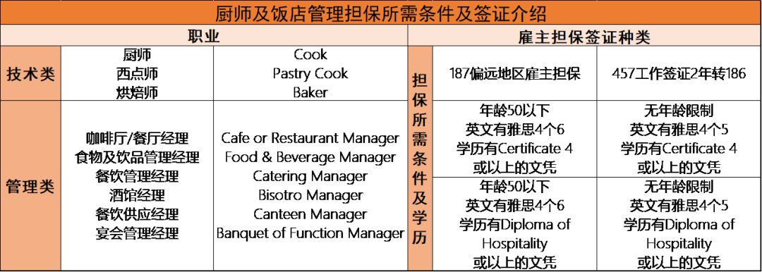 关于厨师、咖啡厅、餐厅经理等等相关职业的移民方式,