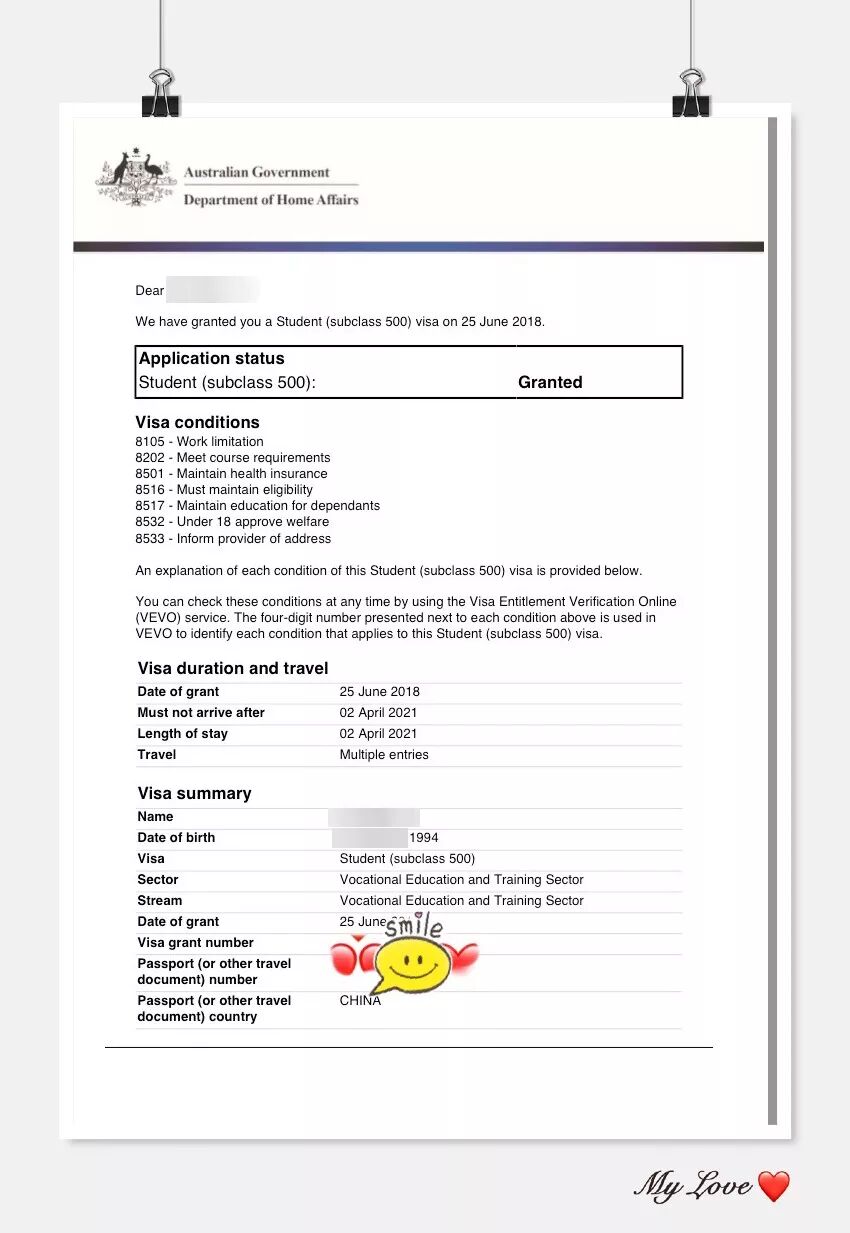 Hello大家好,我很高兴能为游学霸写一篇我的签证心得。我想去澳洲因为我男朋友在澳洲,所以我想了一切办法想去,后来我决定了去462打工度假签证但是我的英文成绩不是很好,也是一个偶然的机会再群里看见这个中介我就开始咨询了,没想到真的成功了。
